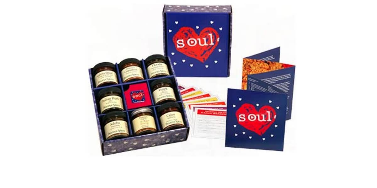 Box contains:dobo Seasoning, Penzeys Curry Powder, Florida Seasoned Pepper, Italian Herb Mix, Cajun Style Seasoning, Galena Street Rib and Chicken Rub, Ozark Seasoning, Penzeys Cinnamon and a Soul pin.