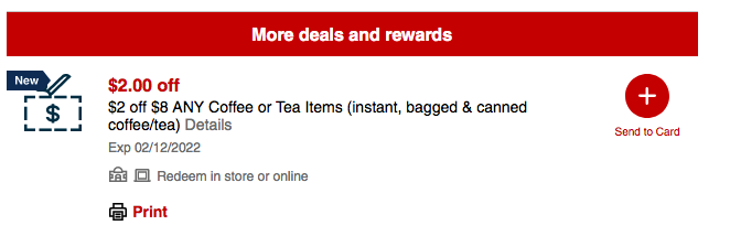 Many shoppers (including me) have reported receiving a $2/$8 any coffee or tea CVS Coupon (select shoppers) to their ExtraCare account. These can be printed at the ExtraCare Coupon Center in store or loaded directly to your card!