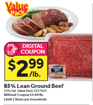 We have a a really nice $1 off per pound Lean Ground Beef, eCoupon (LIMIT 2 packages!) available. After digital offer pay just $2.99 per pound. Bonus, we have a 2package limit instead of the standard 1.
