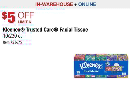 The regular price for Kleenex Trusted Care Facial Tissue, 10/230 ct. is $21.49. There is a $5.00 off instant savings offer which brings the price down to $16.49. That works out to $1.65 per box and $0.007 per tissue.