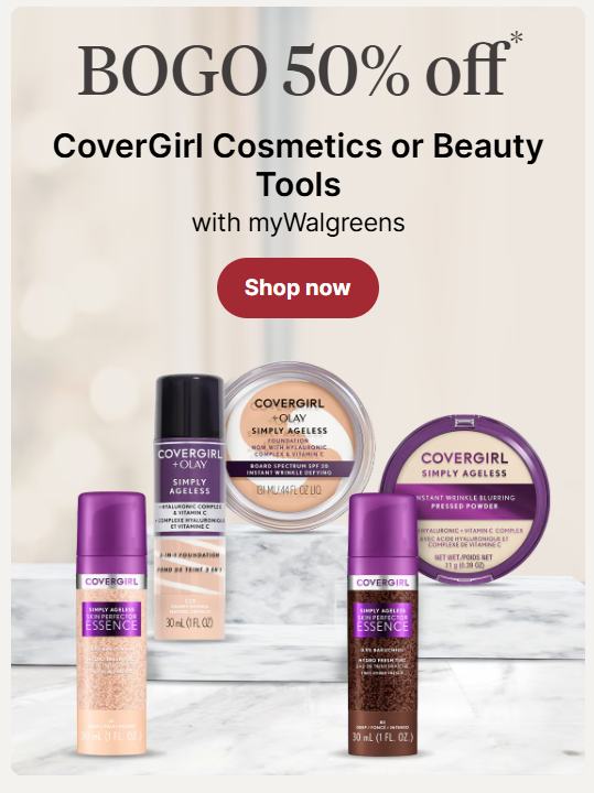 Buy 1 Covergirl Clean Matte BB Cream - $8.99 online priceBuy 1 Covergirl Professional Remarkable Washable Mascara - $6.29 online priceBuy 3 Hallmark Christmas Gift Card Holder Bag Mini - 3/$4.98 sale price (reg. $2.49 each)Buy 3 Complete Home Zipper Bags - 3/$2.79 sale price (reg. $3.49 each) - BOGO 50% off Covergirl sale deducts $3.15 Subtotal $19.90 (reg. $33.22) - use code WAG10 for $1.01 off - $2/1 COVERGIRL Face Product (excludes Cheekers, accessories and travel/trial size), Walgreens eCoupon, exp. 12/21/2024 - $2/1 COVERGIRL Eye Product (excludes 1-kit shadows, accessories and travel/trial size), Walgreens eCoupon, exp. 12/21/2024 - $3/3 Hallmark Holiday Gift Wrap Items (minimum purchase of $3.00), Walgreens eCoupon, exp. 12/25/2024 Pay $11.89 Submit for $4/1 COVERGIRL Face Makeup for select varieties, select sizes. Offer excludes the following: ? Outlast Extreme Wear Pressed Powder (Cappuccino, Natural Beige, Soft Honey, Soft Sable, Classic Ivory, Creamy Natural, Natural Tan, Toasted Almond) ? Outlast Extreme Wear Concealer ? Simply Ageless Triple Action Concealer (Light, Espresso, Soft Sable) ? TruBlend Matte Made Liquid Makeup (Fair Porcelain, Porcelain, Natural Ivory, Classic Beige, Warm Beige, Soft Honey) ? Simply Ageless Serums (Skin Blurring, Eye Lift) ? Simply Ageless Pressed Powder (Soft Sable) ? TruBlend Pressed Powder (Translucent Sable) ? AquaSmooth Compact Foundation (Natural Ivory, Classic Beige, Ivory) ? Cheekers Blush Powder Blusher (Peach Glitter, Natural Rose, Soft Sable, Classic Pink, Rose Silk) ? Makeup Masters ? Trial and travel sizes(Varies by User) (LIMIT 5), Ibotta Rebate, exp. Varies And $4/1 COVERGIRL Eye Makeup for select varieties, select sizes. Offer excludes the following: ? EasyBreezy Brow Powder Kit ? Simply Ageless Lash Plumping Mascara ? Lash Blast Full Lash Bloom Mascara ? Get In Line Liquid Eyeliner (Black Vinyl) ? Lid Lock Up Eyeshadow Primer ? Eye Enhancers 1Kit Mono Shadow ? Trial and travel sizes(Varies by User) (LIMIT 5), Ibotta Rebate, exp. Varies Final cost $3.89 for everything!