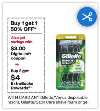 Check out this Razor-sharp DEAL at CVS this week! Now through 7/26, select Gillette or Venus Disposable Razors are on sale BOGO 50% off and we’ll get $4 ExtraBucks Rewards when we buy 2. And we have coupons for both women’s & men’s in the app to go with it! If you could use shaving cream instead, the Foamy shave cream are included! This deal is Limit 1, so choose which you’d like to do!