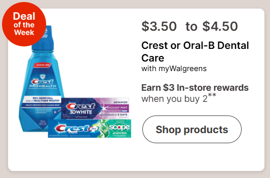 Great FRESH deal at Walgreens through 10/18! Select Crest or Oral-B Dental care are on sale for $3.50 and are buy 2 Get $3 In Store Rewards! We also have a digital coupon!