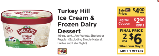 We have this $2/2 Turkey Hill Ice Cream When you Buy TWO (2) 46-oz. cont., Any Variety, Sherbet or Regular (Excluding Simply Natural, Barbie and Late Night) *Redeem up to 4 times in a single order., ShopRite eCoupon, exp. 10/25/2025coupon available to clip, making these just $3.00 each