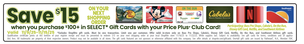 Another awesome ShopRite Gift Card Deal is back! Through 11/15, ShopRite will have a Buy $100 or more on Select Gift Cards between 11/9-11/15 and receive a $15 Off Your Next Order printed on your register receipt and it is redeemable from 11/16 -11/22 You must use your Price Plus Card when purchasing the cards. There is a limit of 1 per customer.