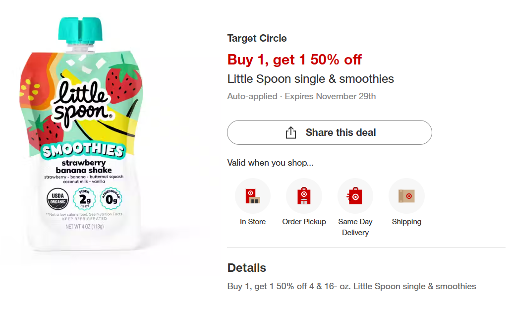 Check out this Baby deal at Target this week! The Little Spoon Smoothie pouches are on sale BOGO 50% off. And that’s not all! We have stacking rebates to get some super cheap! Do this in-store so you have a receipt for the rebates.