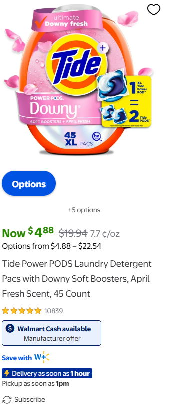 Check out this CLEAN CHEAPIE to add to your Walmart list! Tide Power PODS Laundry Detergent Pacs with Downy Soft Boosters 45 Count are on HUGE Rollback for $4.88 (reg. $19.94), and available for pickup! HURRY these won’t last!