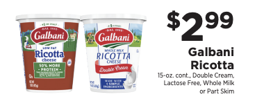 Through 1/24, ShopRite has the Galbani Ricotta Cheese 15oz on sale for $2.99