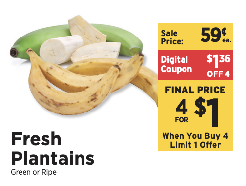 We have this $1.36/4 Fresh Plantains When you Buy FOUR (4) Green or Ripe, ShopRite eCoupon, exp. 04/18/2026 available to clip, making these just $0.25 each.